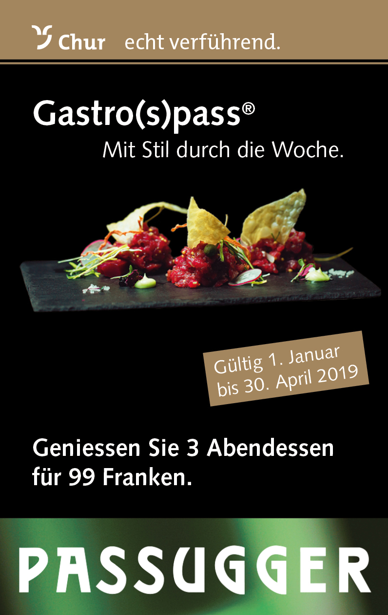 Von Januar bis April 2019 laden wieder 14 ausgewählte Restaurants in Chur und Umgebung von Sonntag bis Donnerstag jeweils abends zum Gastro(s)pass ein. Der Gast erhält für 99 Franken drei Abendessen mit drei Gängen, inkl. Passugger/Allegra und Kaffee. In dieser Saison ganz neu dabei ist das Restaurant Süsswinkel. Der beliebte Gastro(s)pass ist ab dem 3. Dezember im Regionalen Infozentrum im Bahnhof, bei den teilnehmenden Betrieben und jetzt bereits schon über www.gastrospass.com erhältlich. Ein perfektes Weihnachtsgeschenk, welches man gleich zusammen mit dem Partner, der Familie oder Freunden einlöst.